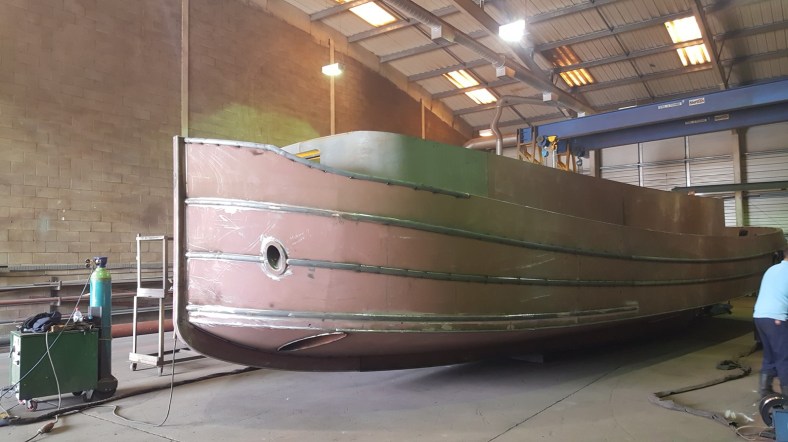 The completion date has slipped again, the latest plan is to put the boat in the water on the 6th September at Reading. Hopefully a bit of summer will still be around. The windows and portholes are stuck in Holland for some reason slowing a few things down.  Alot of the wood for furniture, bulkheads and paneling is complete waiting for fitting. The inside needs spray foaming for insulation then the plumbing and wiring fitted. She’s certainly taking shape but a great deal to do yet. I’ll be back up in 2 weeks and should see a significant difference. Once the steelwork is completed things seem to move fast. Can’t wait to get on the water, although I’d be happy to be in it on such a scorching day as today. Cheers